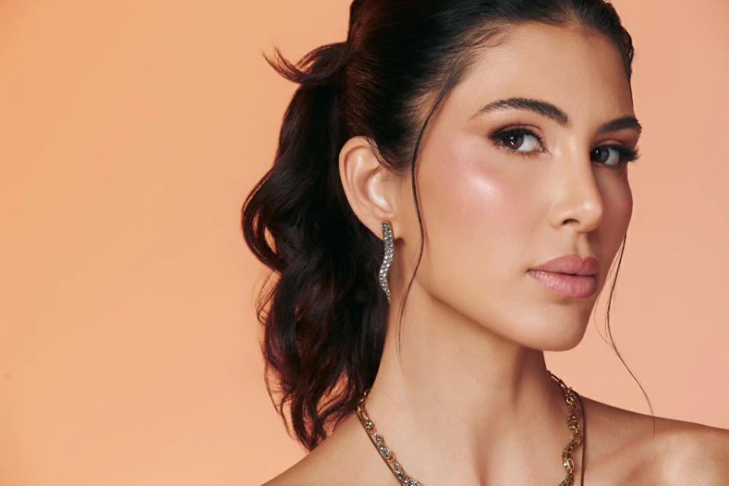 O Brinco Solar Raio M Cravejado Ouro da Morena Canela reflete o brilho e a força do sol em um design moderno e envolvente.