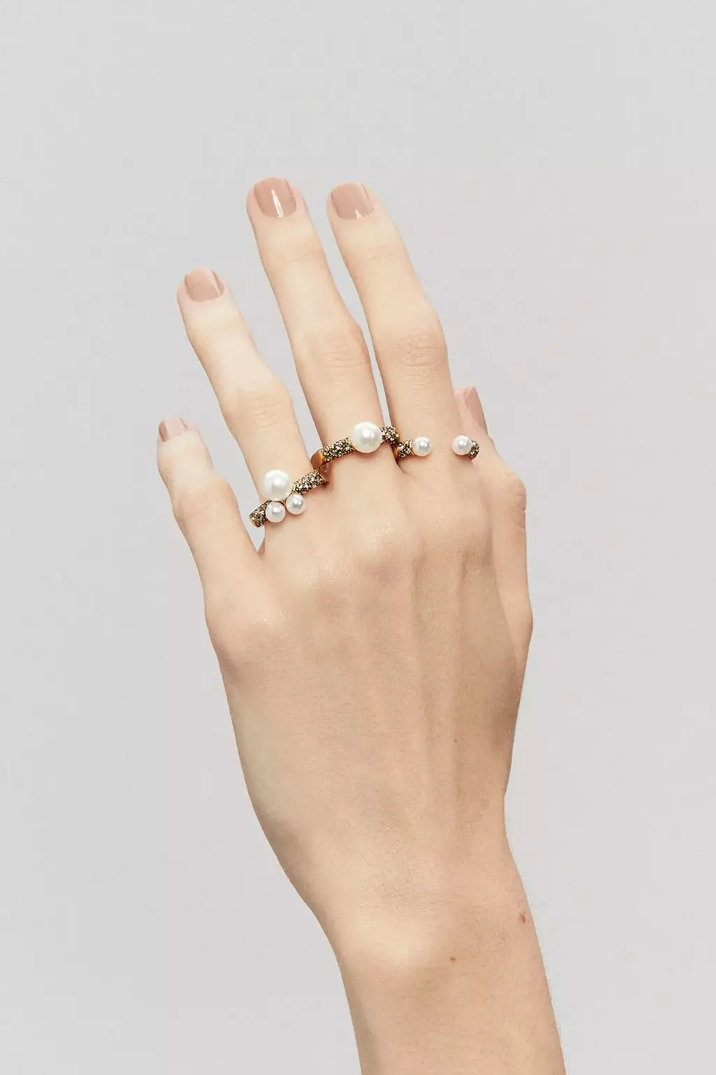 Coleção A-Logical - Fascínio A pérola é o elemento principal do drop Fascínio, trazendo seu lado clássico com uma releitura contemporânea. Os formatos das pérolas relembram os corais do fundo do mar, ao mesmo tempo que assemelham aos pés de jabuticabeira, idênticos pelas suas formas fartas, orgânicas e encantadoras. Para proporcionar um toque feminino e hipnotizante, as pérolas aparecem com acabamentos incrustrados em brincos, braceletes, colares e anéis. O Kit de Anéis Fascínio foi produzido artesanalmente, aplicando as técnicas da joalheria, no banho Ouro Vintage, com cristais cravejados manualmente