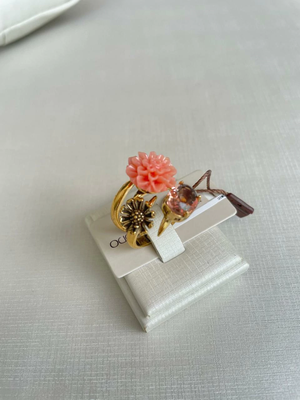 Moldados em latão com banho de ouro, os anéis trazem símbolos que unem sofisticação e espiritualidade: a flor crisântemo em tom coral, que evoca suavidade e renovação; o detalhe dourado em forma de flor, que reforça a força da natureza; e a pedra em cristal lapidado rosé, que irradia brilho e feminilidade.