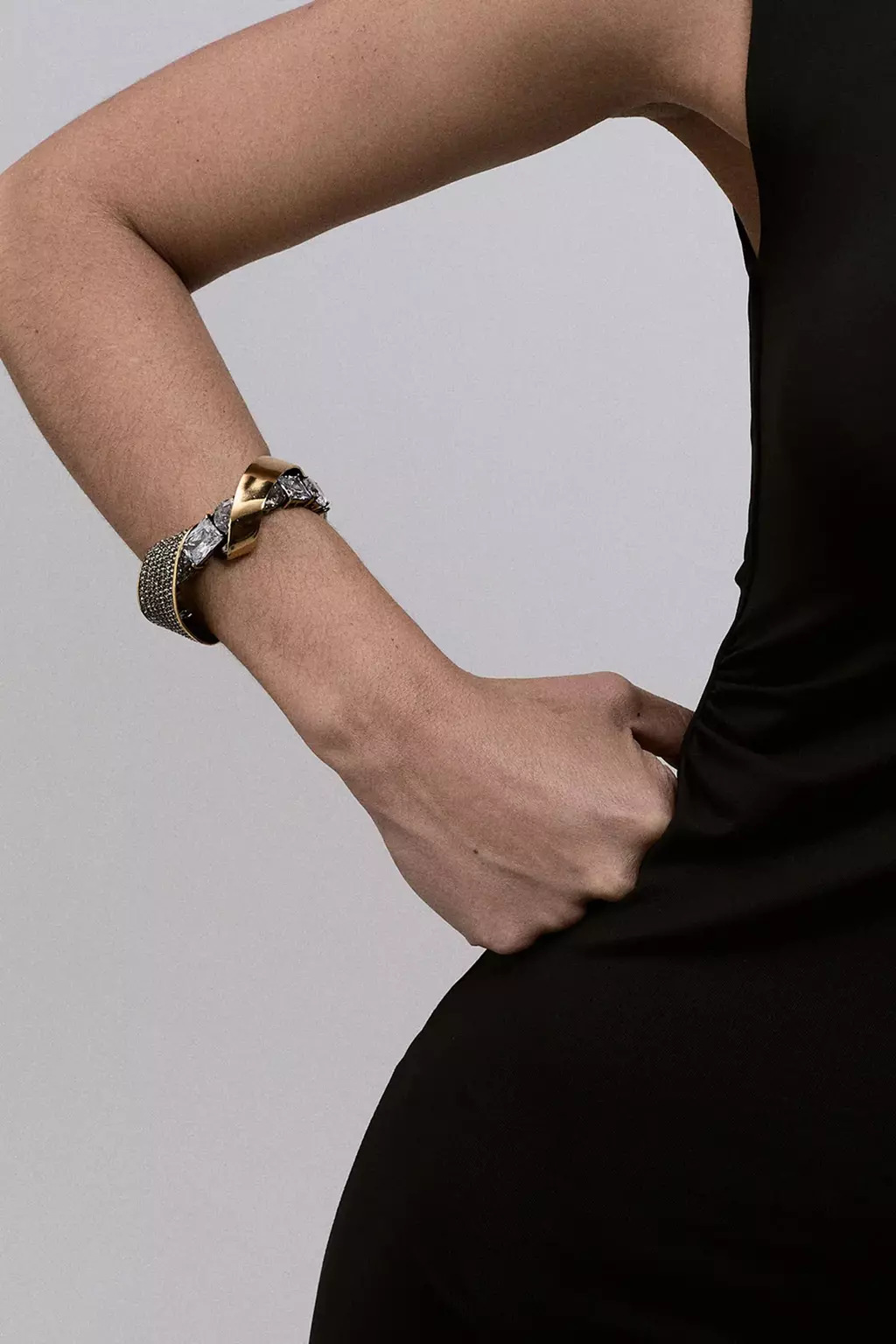 A Pulseira Conceito Brisa foi produzida artesanalmente, aplicando as técnicas da joalheria, no banho Ouro Vintage, com cristais cravejados manualmente. Tamanho 22 cm